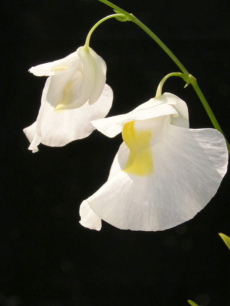 Zbarvení květů je bílé s velkou žlutou skvrnou na vypouklé části dolního plátku koruny. Z přírody jsou známé i typy s mírně nafialovělým nádechem.
